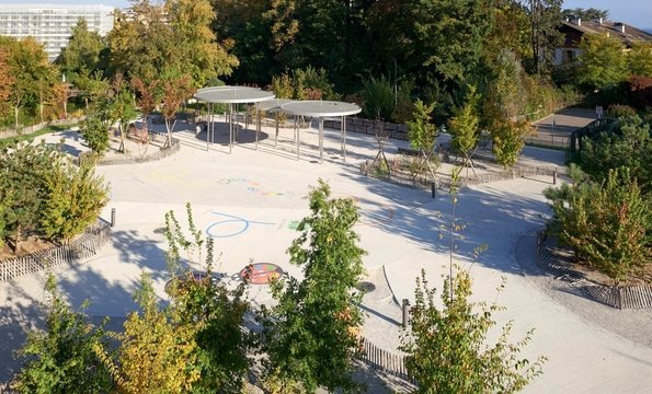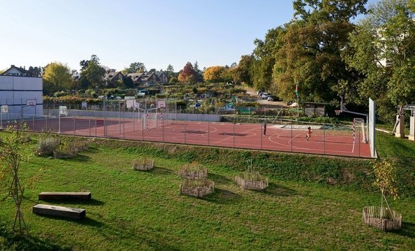 Les aménagements extérieurs situés entre l’école et les jardins familiaux sont terminés, y compris les plantations et les terrains de sports.